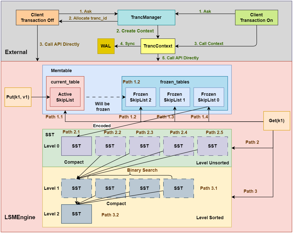 通过架构图,你将清晰地看到本项目如何将复杂的存储引擎划分为外部接口层 (External)、事务管理层 (TrancManager, TrancContext, WAL) 和 LSM引擎核心层 (LSMEngine)。项目完成过程中, 分析这种具体的架构图,你将培养从宏观上把握系统整体设计的能力,理解各组件的职责边界和接口定义。学习如何通过图表化的方式来表达和理解复杂的系统架构,这对于未来设计自己的系统或理解其他复杂系统至关重要。